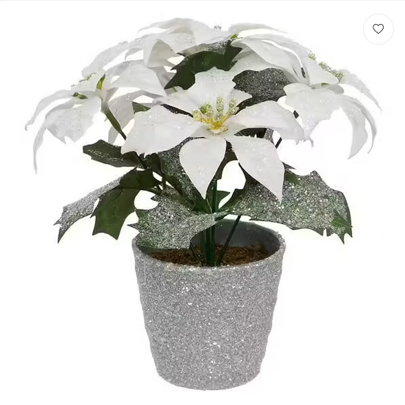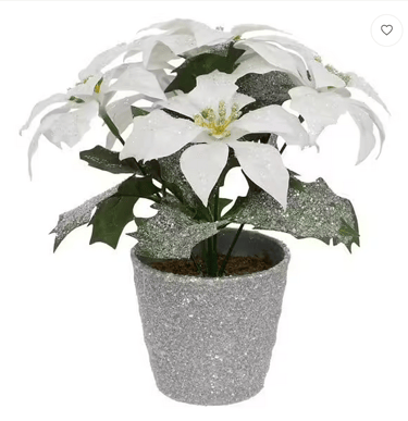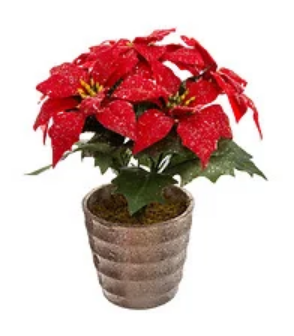 Pot lesté, plante artificielle Poinsettia rouge ou blanc pailleté diamètre 17 cm, hauteur 22 cm.