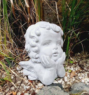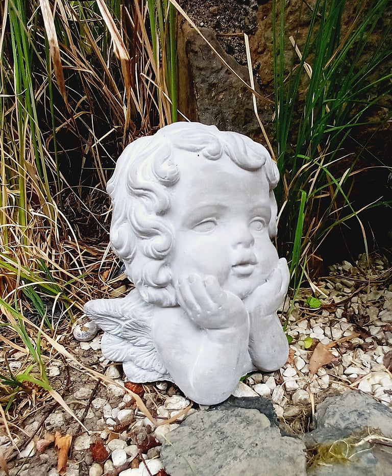 Ange ciment gris clair. Dimensions: hauteur: 20 cm, largeur: 18 cm. Tarif: 21€ livraison sur la tombe comprise.