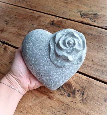 Coeur ciment blanc. Dimensions: longueur: 16 cm, largeur: 16 cm, hauteur: 5 cm. Possibilité de rajouter un message peint de votre choix. Tarif: 18,50€ livraison comprise.