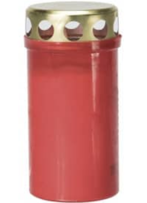 Bougie rouge Dimensions: diamètre: 5,5 cm x 12 cm. Tarif: 3€
